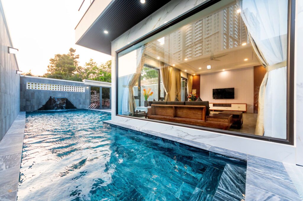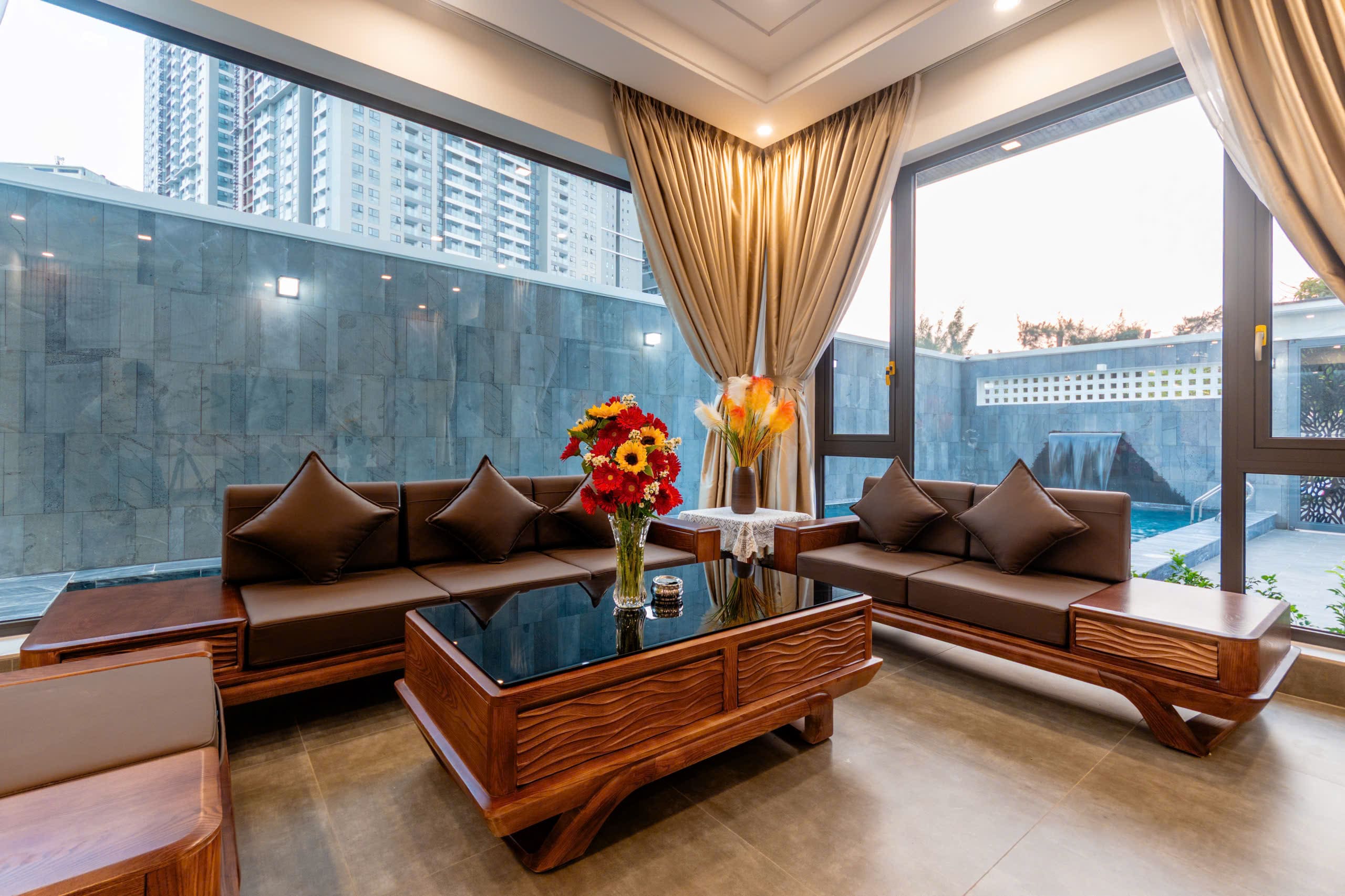• Phòng khách rộng, sofa gỗ sang trọng, cửa kính view hồ bơi cực chill